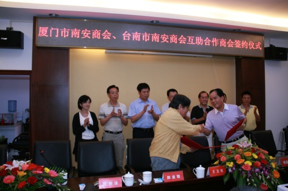 本刊讯 2011年6月28日,是厦门市南安商会成立两周年的日子。这天下午,来自海峡彼岸的台南市南安商会会长郑道聪先生、台南市南安商会常务副会长李锦泉先生以及来自南安的中共南安市委统战部副部长、南安市工商联(总商会)党组书记王卫东先生、南安市台办主任陈创泳先生、南安市工商联(总商会)常务副会长苏立新先生、南安市台办副主任郑青年先生、南安市委统战部办公室主任、经济科科长洪国祥先生、厦门市南安商会会长侯昌财先生等商会成员共70多人在厦门市南安商会会议厅欢聚一堂,共同纪念商会成立两周年,并与台南市南安商会缔结友好互助关系,同时举办《成功之路》宣传片首映式和《成功在厦门》会刊首发式。